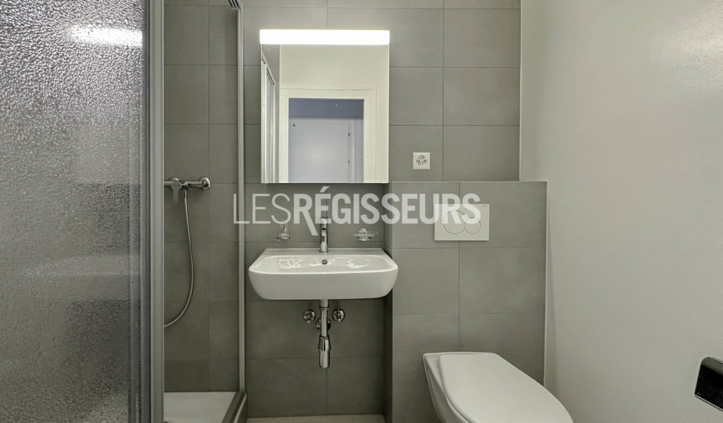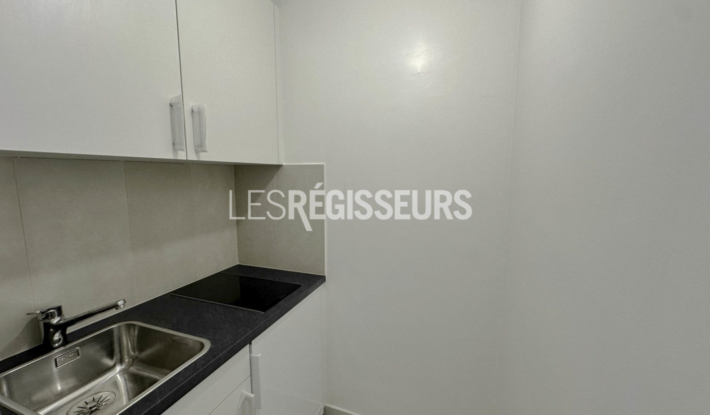 Beau studio entièrement rénové comprenant : une kitchenette neuve, équipée (plaques de cuisson, hotte et un petit réfrigérateur) et une salle de douche avec WC.