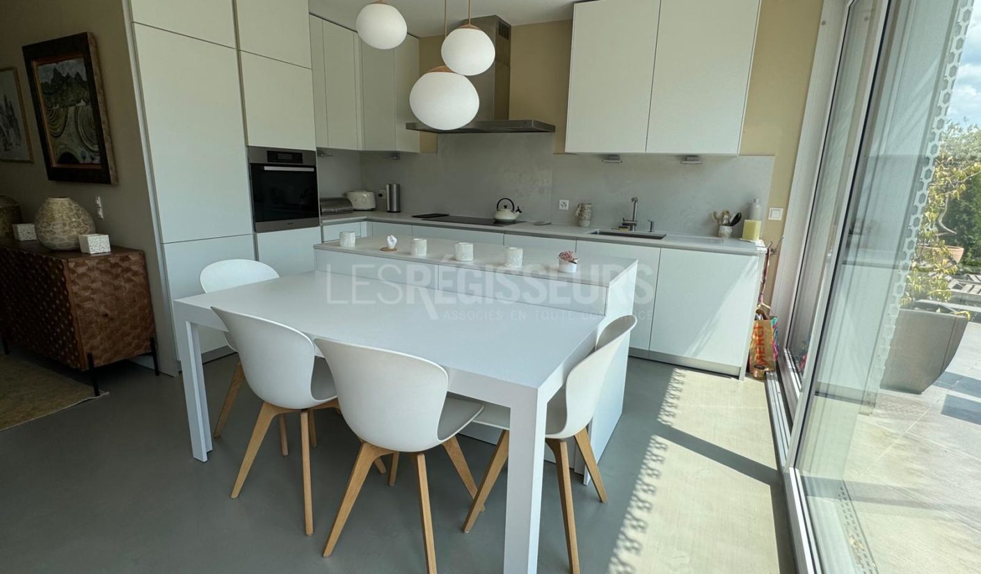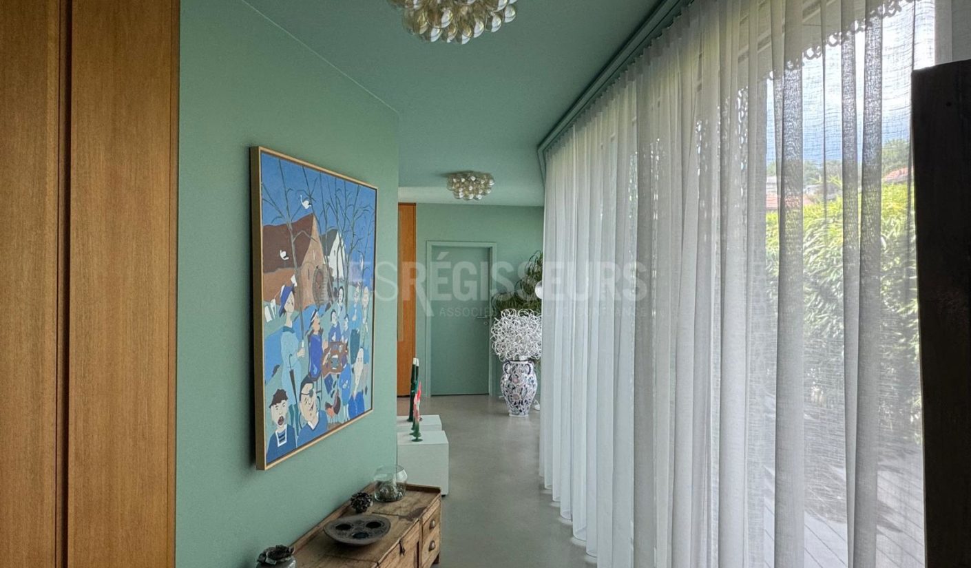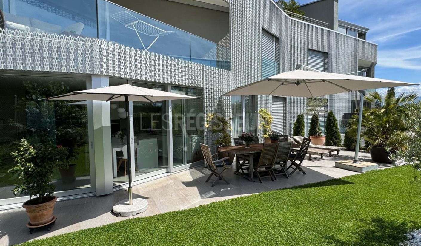 Dans un petit immeuble contemporain de 4 appartements construit en 2015, superbe 5.5 pièces traversant en rez-de-jardin, entièrement rénové en 2023. Le vaste séjour avec cuisine Bulthaup entièrement équipée s’ouvre sur un grand jardin privatif joliment arboré, complété par deux terrasses, le tout à l’abri des regards.